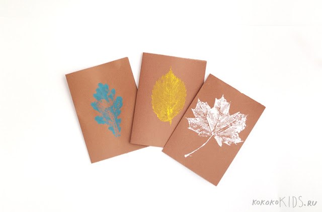 Например, с помощью отпечатка (сделанного с помощью краски) листочки на листе цветной бумаги, можно сделать замечательные осенние открытки.