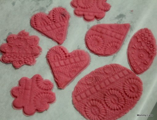 Возьми кусочек кружева, положи на раскатанный пластилин и аккуратно пройдись по нему сверху скалкой.