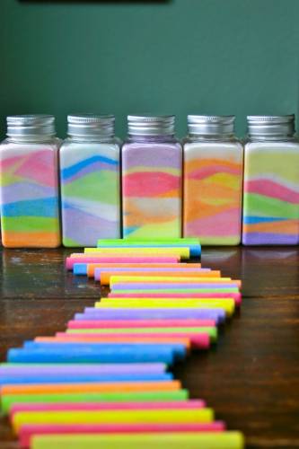 Возьмите цветной мелок нужного вам цвета и начните аккуратно катать его по соли. Постепенно соль будет окрашиваться в цвет мелка.