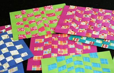 Раскрой лист бумаги, возьми полоски бумаги другого цвета и начинай плести салфетку. Чередуй полоски, пропущенные под основой и заплетенные над. Чередуй - пропускай листочек под бумагой, и над бумагой.