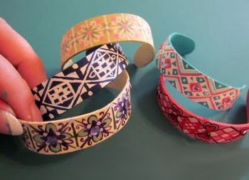 Осталось раскрасить браслеты своими руками красками, украсить тканью, бумажной аппликацией в технике декупаж, бусинками, пуговицами или чем-то другим.